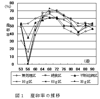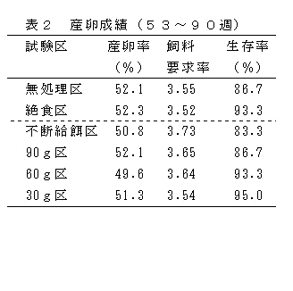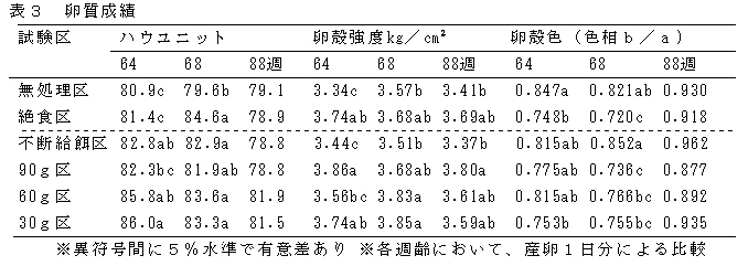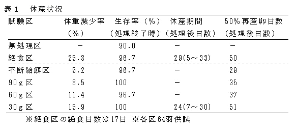 産卵後期(53週齢)の卵用名古屋種で、夏季にふすま主体換羽飼料を用いた制限給餌(30g/羽・日、21日間)の誘導換羽処理により、絶食(体重25%減)と同等の産卵成績及び卵質成績の改善効果を得ることができる。 | ||||||||
