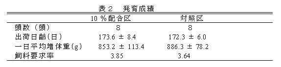 肉豚肥育用配合飼料にDDGSを10%配合した飼料を肥育豚に給与しても、発育成績である一日平均増体重、飼料要求率に有意差は認められない(表1、2)。 |