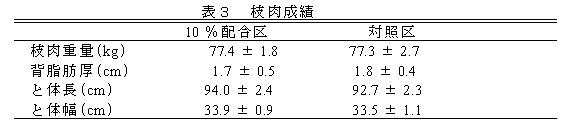 枝肉成績である枝肉重量、背脂肪厚、と体長、と体幅に有意差は認められない(表3)。 |