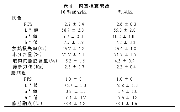 肉質分析における胸最長筋の肉色、加熱損失率、水分含量、筋肉内脂肪含量、剪断力価及び背脂肪内層の色も同様に有意差は認められない(表4)。 |