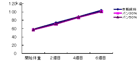 市販飼料とパン残さ混合飼料では発育に差はなく(図1)、パン残さ混合飼料の飼料要求率は配合飼料と同程度である(表1)。 |