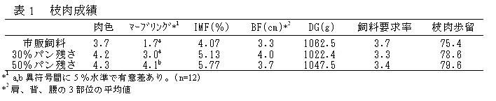 パン残さ混合割合50%が最も良い霜降り状態で、味も良くなると思われるが、厚脂になる可能性もあるので、豚の品種特性や出荷後の取引方法を考慮する必要がある。 |
