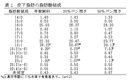 パン残さ混合飼料の一般成分は市販飼料と比較して、粗蛋白質、粗灰分、粗繊維、カリウム、リン、水分は低く、粗脂肪が高い。アミノ酸組成では、パン残さ混合飼料では、グルタミン酸およびプロリン以外は全て市販飼料より低い。また、脂肪酸組成は、パン残さ混合飼料は、市販飼料と比較してオレイン酸(18;1)が高く、リノール酸(18;2)が低い。 |