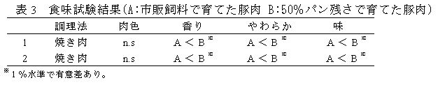 市販飼料および50%パン残さ混合飼料で育てた豚のロース部分(背最長筋)を20~50代の計65名のパネーラーを対象に2回食味試験を実施し、2点比較法により判定する。その結果、パン残さ混合飼料で育てた豚肉は、市販飼料のものと比較して香りが良く、柔らかくておいしい(表3)。 |