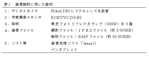 豚ロース芯画像の取得方法は、写真撮影用の市販簡易スタジオのなかに試料を置き、光源は東芝フォトリフレクタランプ(500W)を2基用い、光の反射を抑えるよう左右から照明を当て、デジタル一眼レフカメラ(撮影モード:AUTO,画素数:3872×2592ピクセル)で撮影する。脂肪交雑割合(ロース芯面積に対する脂肪交雑の総面積割合)の算出は、フリーウェアである画像処理ソフト「ImageJ」で処理する。(表1) |