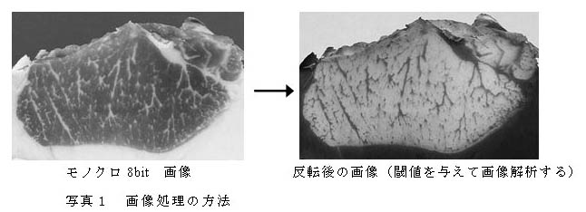 デジタルカメラでロース芯断面を撮影し、画像処理ソフトウェア「ImageJ」を用い、適切な画像処理をすることにより脂肪交雑の評価は可能であり、画像解析により算出した脂肪交雑割合と筋肉内脂肪含量は有意に高い相関関係にある。 |