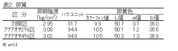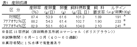 産卵鶏にアナアオサを2%飼料添加することにより、産卵性を維持しながら、卵黄中にルテインを1.2倍含み、ハウユニットが高く、卵黄色の濃い鶏卵を生産できる。さらに産卵鶏の細胞性免疫を増強することができる。 | ||||||||