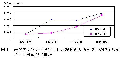 高濃度オゾン水を62cm×38cmの踏み込み消毒用として利用するには、長時間放置すると殺菌効果が低下するため、使用しない場合も少なくとも3時間に1回の交換が必要である。また、効果を持続するために蓋をすることも良いと思われる(図1)。