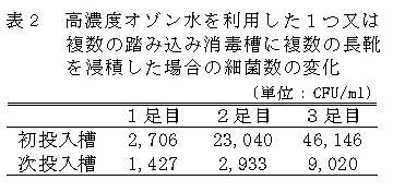 作業後の汚れた長靴を高濃度オゾン水消毒槽に浸漬すると、2足目には殺菌効果が低くなることから、1足毎に高濃度オゾン水を交換するか、又は、踏み込み消毒槽を複数用意することが必要である(表2)。