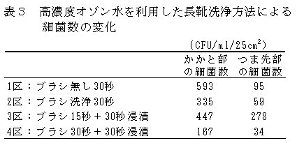 高濃度オゾン水による長靴洗浄方法として、オゾン水のみで長靴を洗浄するより、ブラシを併用した方が洗浄効果が認められる。しかし、ブラシを併用しても15秒間の洗浄では、洗浄後に高濃度オゾン水に浸漬しても殺菌効果は低下する。高濃度オゾン水による長靴洗浄方法として、30秒以上のブラシ洗浄した後に更に高濃度オゾン水に浸漬する方法が一番良好である(表3)。 |
