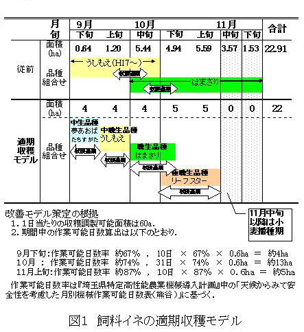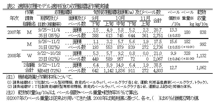 2006年までの作業請負組織(M)の作業実績から、フレール型収穫機(ベール径85cm)利用体系での収穫可能面積は約60a/日である。一方、従来の‘はまさり’‘うしもえ’の2品種では適期収穫は10月上中旬の約20日間であり、期中の作業可能日数率75%(図1脚注)から、収穫面積が10haを超えると適期収穫が難しい(表1)。 |