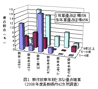 食糧自給率の向上と輸入飼料価格高騰に対応し、また、将来のバイオエタノール原料生産も視野に置くと、耕作放棄地を活用したソルガムの生産が有効な対策の1つとして期待できる。しかし、耕作放棄地でのソルガム栽培にはいくつかの困難が予想され、なかでも雑草対策は重要であるが、生産コストや環境保全の観点から除草剤の使用はできるだけ避けたい。これまでに長野県の普通畑において、bmrの兼用型ソルガム「葉月」を使い播種量8kg/10aで散播密植し、1番草の茎数を200本/m2 程度確保して、雑草害を回避する除草剤を使わない栽培法が確立されている(平成12年および13年度成果情報)。また、長野県の耕作放棄地では、耕作地への復元が比較的容易と考えられるイネ科主体の1年生雑草優占の圃場が55%あり、耕作放棄年数が短いほどその割合が高い(図1、このうち45%の圃場は毎年、耕起または雑草の刈り払いがされている)。そこで本研究では、1年生雑草優占の耕作放棄地に対するこのソルガムの散播密植栽培法の有効性を実証する。 | ||||||||