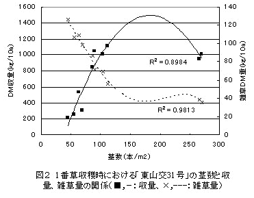 1年生雑草が優占する耕作放棄地において、ソルガム1番草の茎数を1m2当たりおおむね150~200本確保する散播密植栽培を行うことにより、除草剤を使用しないソルガム栽培が可能である。 | ||||||||