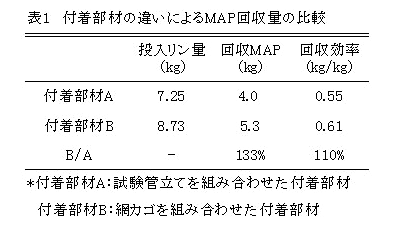 付着部材としてステンレス製の試験管立てを組み合わせて用いた従来法に比べ、ステンレス製の網カゴを重ねる方法により、MAPの回収量が10%向上する(表1)。