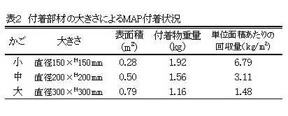 付着部材の大きさ別によるMAP付着状況は、直径が小さく表面積が小さいカゴの方が回収総量及び単位面積当たりの回収量が多くなった。このことから、空気の通り道にあたる中心部に付着部材を配置することでMAP回収量が増加する(表2)。