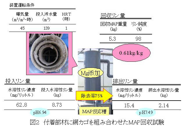 本装置の処理能力は、運転条件を汚水反応時間(HRT)1時間、曝気強度45m3/m3・時とし、前述1で調整した塩化マグネシウム溶液を汚水量に対して0.1%添加する。上記ステンレス製の網カゴを重ねた付着部材を用いた際、リン除去率は75%、投入リン量あたりの付着回収MAP量が0.61kg/kgで、純度98%のMAPが回収できる(図2)。 |