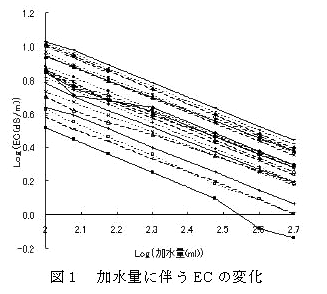 家畜ふん堆肥(牛・豚・鶏及び混合堆肥)21点の風乾物10gに水100mlから順次加水してECを測定、ECと加水量双方を対数変換して作図すると、ほぼ同様の傾きを持つ直線が得られる。(図1) |