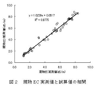 作成した式の妥当性を評価するために、上記21点を含む計53サンプルについて水分、現物EC及び風乾物ECを測定し、換算式によって得られた推定値と比較して適合性を検証した。その結果誤差の平均は0.3dS/m程度であり、相関も高いことから現場における把握には十分である。(表1)(図2) |