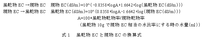 各試料について各データの対数値から水100ml時点EC(風乾物EC)の対数値を減じて各直線をx値2の時y値が0となるように変形した後に各々直線回帰を行う。回帰によって得られた切片及び傾きの平均値により水量の増加に伴うEC対数値の減少を表す式としてy=-0.8358x+1.6642を得た。この式に逆操作(一旦減じた風乾物EC対数値の加算、対数変換したものの復元)を加えて風乾物ECから現物EC値への換算式を作成。さらに変形することで逆方向の換算式を作成。(式1) |