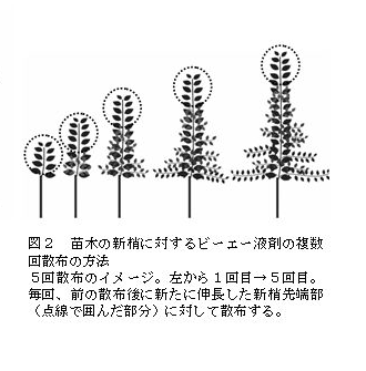 その後、新梢の伸長に合わせて、毎回、新たに伸長した新梢先端部15cmまでの部分にのみ5回散布する(図2)。散布の間隔は概ね10日程度である。 |