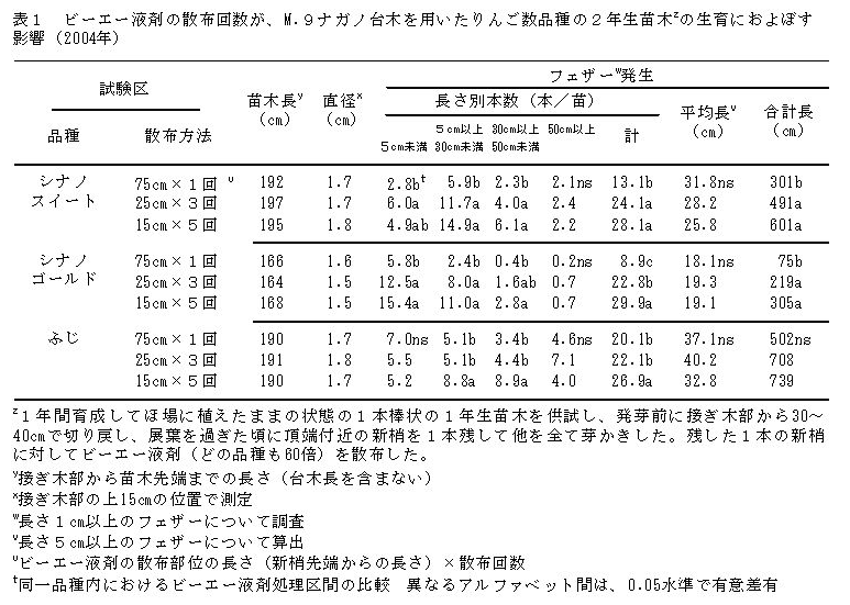以上により、2年生苗木の主幹上に、主軸に対して細く短いフェザーが多発する。ビーエー液剤の散布回数が多いほど、相対的に短めのフェザーが増え、総フェザー長が長くなる(表1)。また、主幹上の比較的高い位置まで連続してフェザーが発生し、わい化栽培向に適した苗木となる。 |