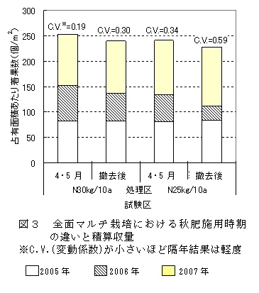 「青島温州」のマルチ栽培では、8月から収穫期の12月まで地表面を被覆するため、養分吸収抑制による樹勢低下が懸念されるとともに、11月の秋肥施用方法が問題になっている。そこで「青島温州」のマルチ栽培における秋肥の施用時期と量について検討する。 |