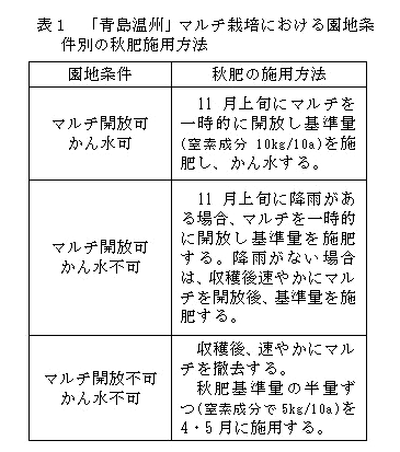 「青島温州」の全面マルチ栽培における園地条件別の秋肥施用法
