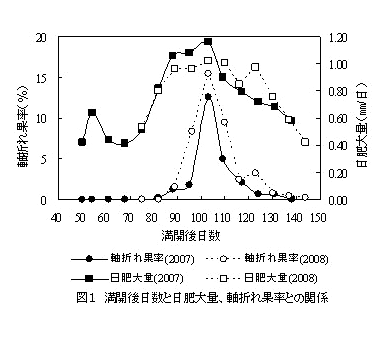 軸折れは満開80日後頃から認められ、日肥大量がピークとなる満開100日後頃にもっとも多くなる(図1)。 |