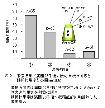 予備摘果後の満開27日後において、大きな果実であっても果梗が仰角45度よりも水平向きの果実では満開80日後以降の軸折れが少ない(図2)。また、この果梗の向きと軸折れとの関係は果台の向きに関わらず同様である(データ略)。 |