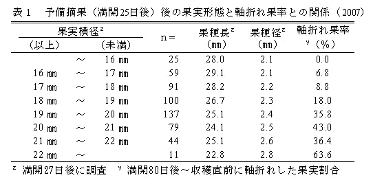 予備摘果後の満開27日後において、果梗が短くて太く、大きな果実ほど満開80日後以降の軸折れが多くなる(表1)。 |