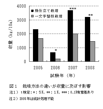 株仕立て栽培の収量は、栽植1年目(2005年)が一文字整枝栽培の約1.4倍、凍寒害当年(2006