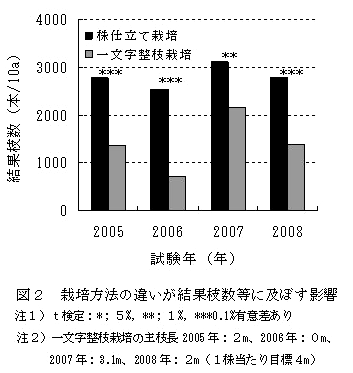 結果枝数は、株仕立て栽培では栽植1年目(2005年)から4年目まで目標の結果枝数(約2770本/10a)をほぼ確保できるが、一文字整枝栽培では主枝長を確保するのが難しく栽植1年目で50