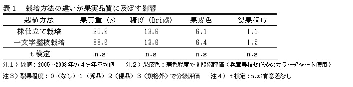 株仕立て栽培の果実重・糖度・果皮色・裂果程度など果実品質は、一文字整枝栽培と同等である。(表1)。 |