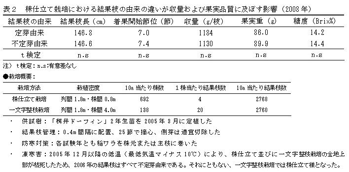 定芽由来結果枝と不定芽由来結果枝の間では、結果枝の生育・収量および果実品質に差がない(表2)。