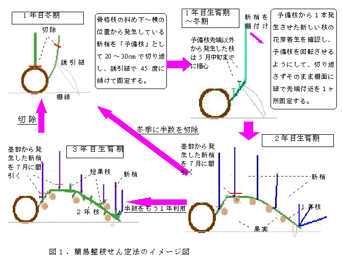 ①予備枝から発生した先端の新梢以外は摘心し長果枝を養成、②長果枝は冬期に先端部のみを棚に固定、③側枝途中から発生した新梢は7月に1回間引、④冬期に側枝の半数は切除し半数は翌年も利用、このパターンで慣行栽培とほぼ同等の果実が収獲できる。 | ||||||||