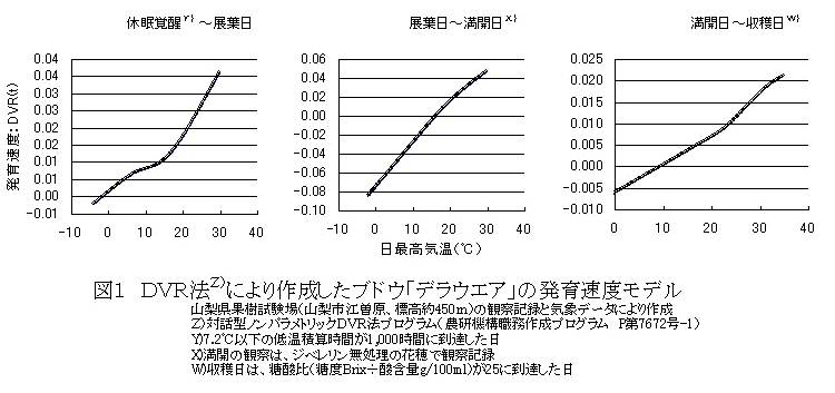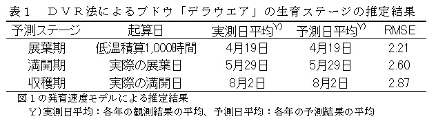 「対話型ノンパラメトリックDVR法プログラム(農研機構職務作成プログラムP第7672号-1)」を用い、日最高気温をパラメーターにした発育速度モデルにより、ブドウ「デラウエア」の生育ステージの推定が可能である(図1、表1)。 |