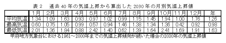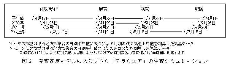 この発育速度モデルに、甲府地方気象台の観測記録をもとにした2030年の予測気温(表2)をあてはめ、将来の生育ステージをシミュレーションすると、冬期の温度上昇にともなって、自発休眠の覚醒は遅れるが、その後の高温環境によって展葉日以降の生育ステージは前進する(図2)。 |