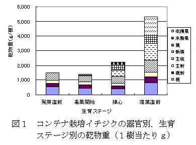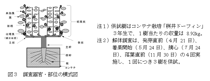 一文字整枝のイチジク「桝井ドーフィン」(結果枝6本/樹)は培養土40リットルのコンテナで栽培した。発芽直前から落葉直前までの4ステージについて器官別に解体し、無機成分含量を分析した(図3)。 |