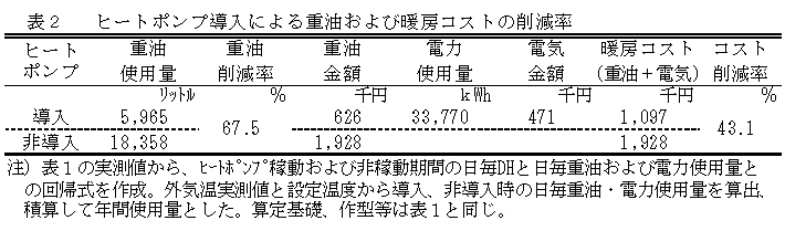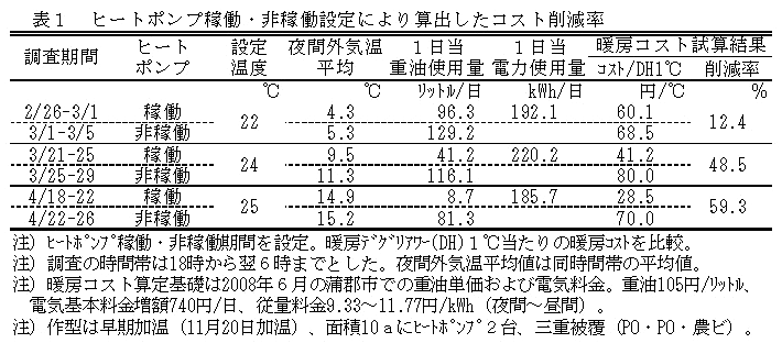 三重被覆した早期加温ハウスミカン栽培において、10馬力のヒートポンプを2台導入しハイブリッド運転することで、重油暖房のみと比較して重油は67.5%削減される。重油単価105円で、電気料金を含めて試算すると暖房コストは43.1%削減される。 |