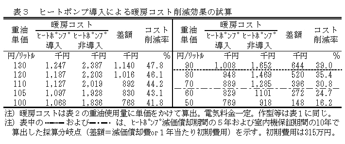 導入による暖房コストの差額と1年当たりの初期費用とが合致する重油単価の採算分岐点については、耐用年数が5年では80円台、10年では60円台となる(表3)。 |