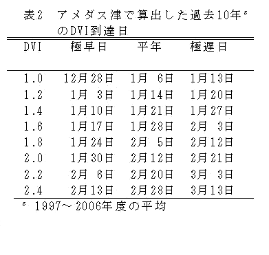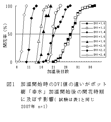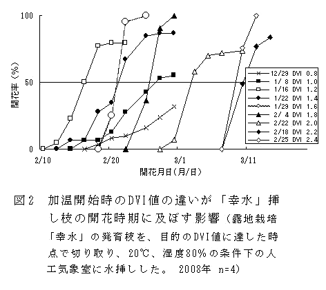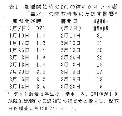 ハウス栽培のニホンナシ「幸水」は、DVI(発育指数)が1.6以降に達する1月下旬頃以降が加温開始の適期である。 | ||||||