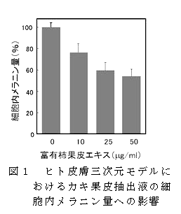 カキ果皮抽出物は、メラニン生成抑制効果を持ちマウスB16メラノーマ細胞においてはコウジ酸と同等以上の活性が認められる(データ略)。またヒト三次元表皮モデル(JTEC社 LabCyte melano model)においても濃度依存的に活性が認められる。(図1)。 |