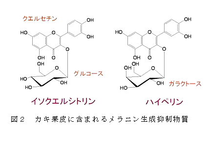 カキ果皮抽出物は、汎用成分であるコウジ酸と同等以上の強いメラニン生成抑制効果があり、活性成分はイソクエルシトリンとハイペリンである。これらは果皮に局在しており、成熟期に多く含まれる。また「松本早生富有」などの完全甘柿に多い。 |