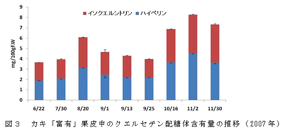 クエルセチン配糖体は、幼果から成熟果までどのステージの果皮にも含まれるが、特に着色が始まると急激に増加する傾向がある。(図3)。 |