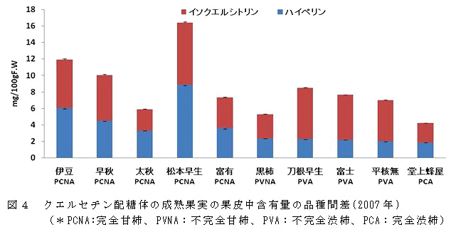 含有量には品種間差が認められ、調査した10品種では約3倍の差が認められる。また完全甘柿で含有量が多い傾向にあるとともに、甘柿と渋柿では2種類の構成比に差が認められる。(図4)。 |