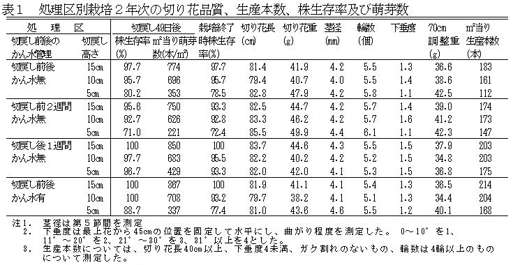 カーネーションの2年切り栽培における適正な切戻しの高さとかん水管理 | ||||||||