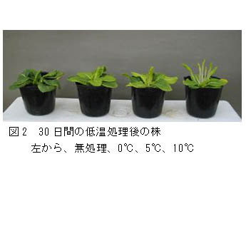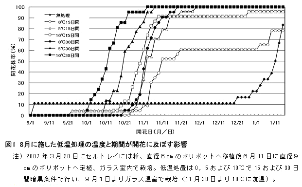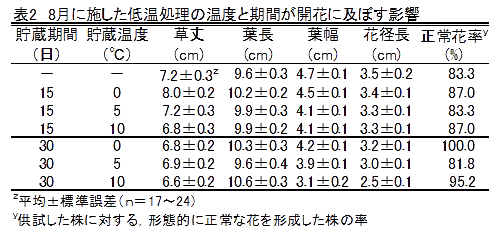 低温処理期間が長いほど、夏場の栽培で問題となる葉やけによる品質低下が減少し、0℃の場合草姿を損なうことなく30日間の低温処理が可能で、8月2日から0℃で30日間の低温処理は2ヶ月ほど開花を早め夏場の高温を回避する上で有効である。 |