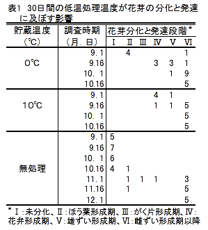 30日間の低温処理中に、既に花芽分化を開始している。低温処理を終了した時に0℃の場合ほう葉形成期にあるのに対し、10℃の場合花弁形成期に達している(表1)。 |