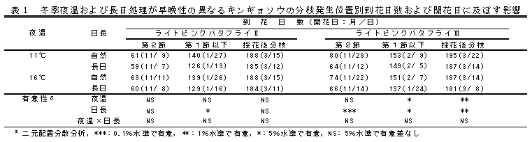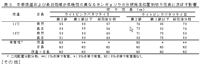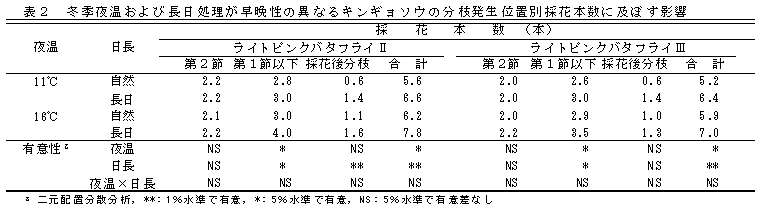 早晩生の異なるキンギョソウ「ライトピンクバタフライⅡ」および「ライトピンクバタフライⅢ」の摘心栽培では、夜温16℃と長日処理において第1節以下分枝の採花本数が増加する。 | ||||||||