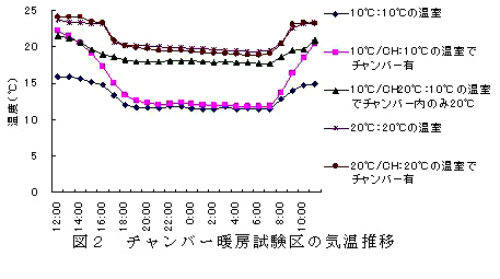 10℃の温室内で、ベンチ上にチャンバー(ビニル製 縦90×横240×高さ100cm)を設置し、中を電熱線(潅水マット内に配線)により20℃で暖房すると、気温は20℃を下回るものの(図2)、20℃の温室で管理した場合と同等の生育を示す(表2)。 |
